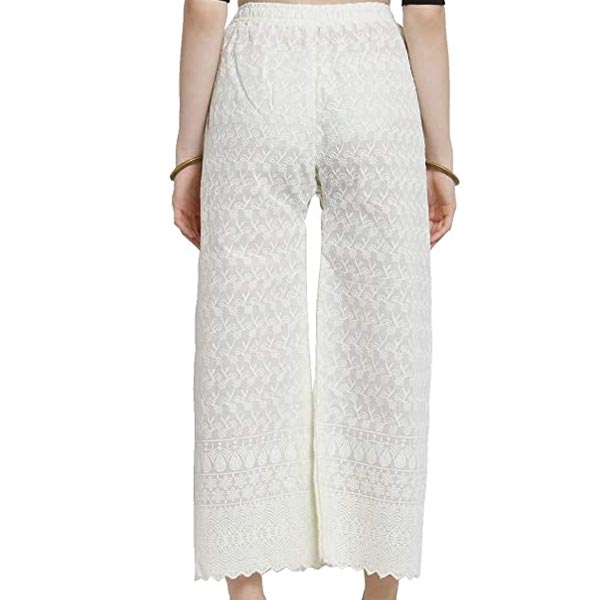- Casual Cotton Chikan Palazzo With Broad elasticated waistband . Stretchable from 28 inches to 44 inches.